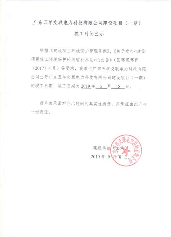 根据《建设项目环境保护管理条例》、《关于发布〈建设项目竣工环境保护验收暂行法〉的公告》(国环规环评〔2017〕4号)等要求,我单位广东五羊交联电力科技有限公司公开广东五羊交联电力科技有限公司建设项目(一期)的竣工日期: