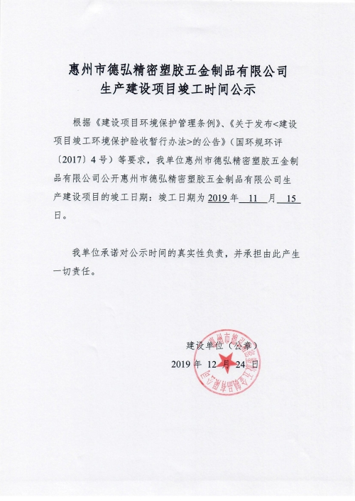 根据《建设项目环境保护管理条例》、《关于发布〈建设项目竣工环境保护验收暂行法〉的公告》(国环规环评〔2017〕4号)等要求,我单位惠州市德弘精密塑胶五金制品有限公司公开惠州市德弘精密塑胶五金制品有限公司生产建设项目的竣工日期: 竣工日期为2019年11月15日。 我单位承诺对公示时间的真实性负责,并承担由此产生一切责任。